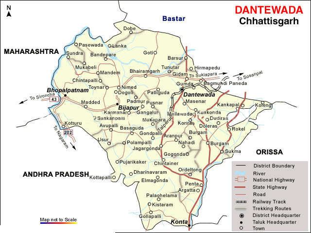 The district of Dantewada stretches from 80 15'42" to 81 58'43" East Longitude and from 18 46'48" to 19 28'30" North Latitude. It is situated in the newly formed state of Chattisgarh in India. The district got its name from Goddess Danteshwari. It is bordered by the district of Bastar in the north, the state of Andhra Pradesh in the south, the state of Orissa in the east and the district of Bijapur in the west. The topography includes valleys, hills, gurgling streams and sparkling waterfalls.